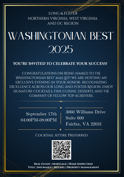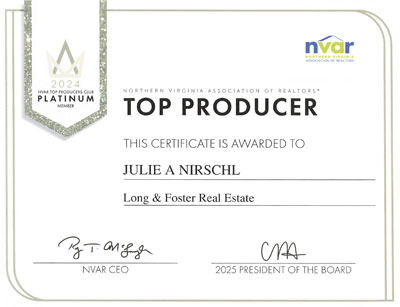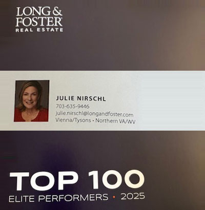 Julie is consistently recognized as one of the top Realtors in Northern Virginia. She has been featured in Washingtonian Magazine’s Best Realtors issue, honored as an NVAR Top Producer, named to the Long & Foster Top 100 (out of approximately 7,000 agents), is a proud member of the Long & Foster Gold Team, and is listed among the Top Real Estate Professionals in America.
